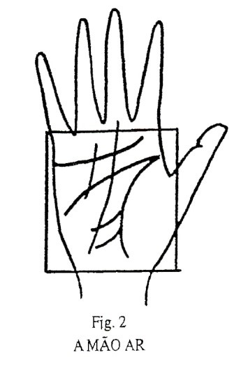 MÃO AR - Semelhante à mão terra, mas com dedos mais longos e muitos traços em sua palma. Indica Pessoa de mente vívida e questionadora. Sempre quer conhecer mais, investigar, aprender e descobrir. São amistosas e possuidoras de um sistema nervoso delicado. São propensas ao tédio, depressão, angústia a dores de cabeça e a fadiga mental, além de problemas respiratórios como gripes, resfriados e doenças relacionadas à garganta, aos ouvidos e ao nariz. Ervas indicadas: alfazema, hortelã, gengibre e flor de sabugueiro; Minerais: cloreto de magnésio e Equinácea.