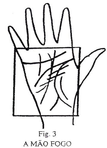 MÃO FOGO - Semelhante à mão ar, todavia com dedos mais curtos e maior número de traços. Revela pessoas ativas e dinâmicas. Estão em constante movimento. Aonde quer que vá espalham entusiasmo e inspiração; é uma pessoa extrovertida. Gosta de ser o centro das atrações. Têm predisposição a problemas cardiovasculares, colapsos, gripes, febres e problemas na coluna vertebral. Ervas indicadas: lima, verbena, e hamamelis, além de azeitonas verdes; Minerais: sódio, vitamina E, azeite de oliva e cloreto de magnésio.